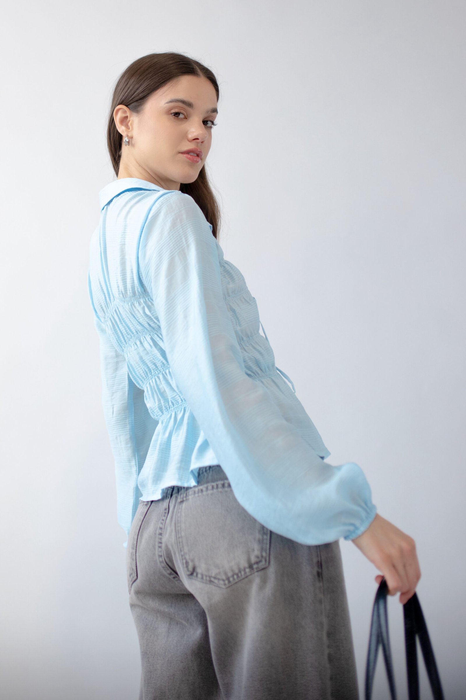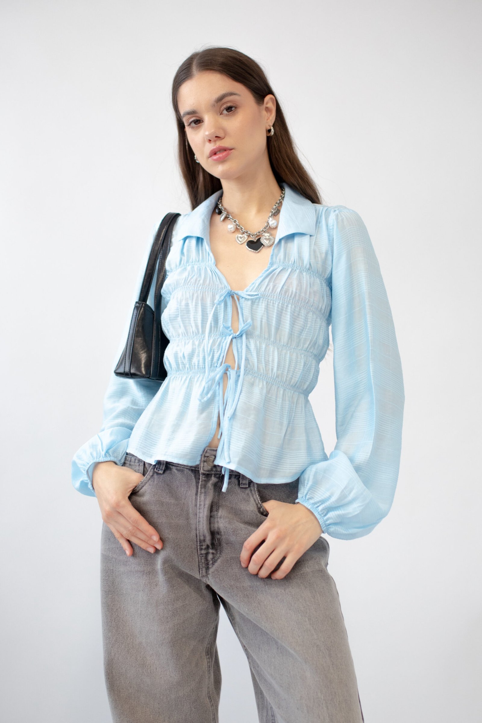 Blusa con detalle de recogido y pitas en el delantero, lleva un elástico embolsado en las mangas.