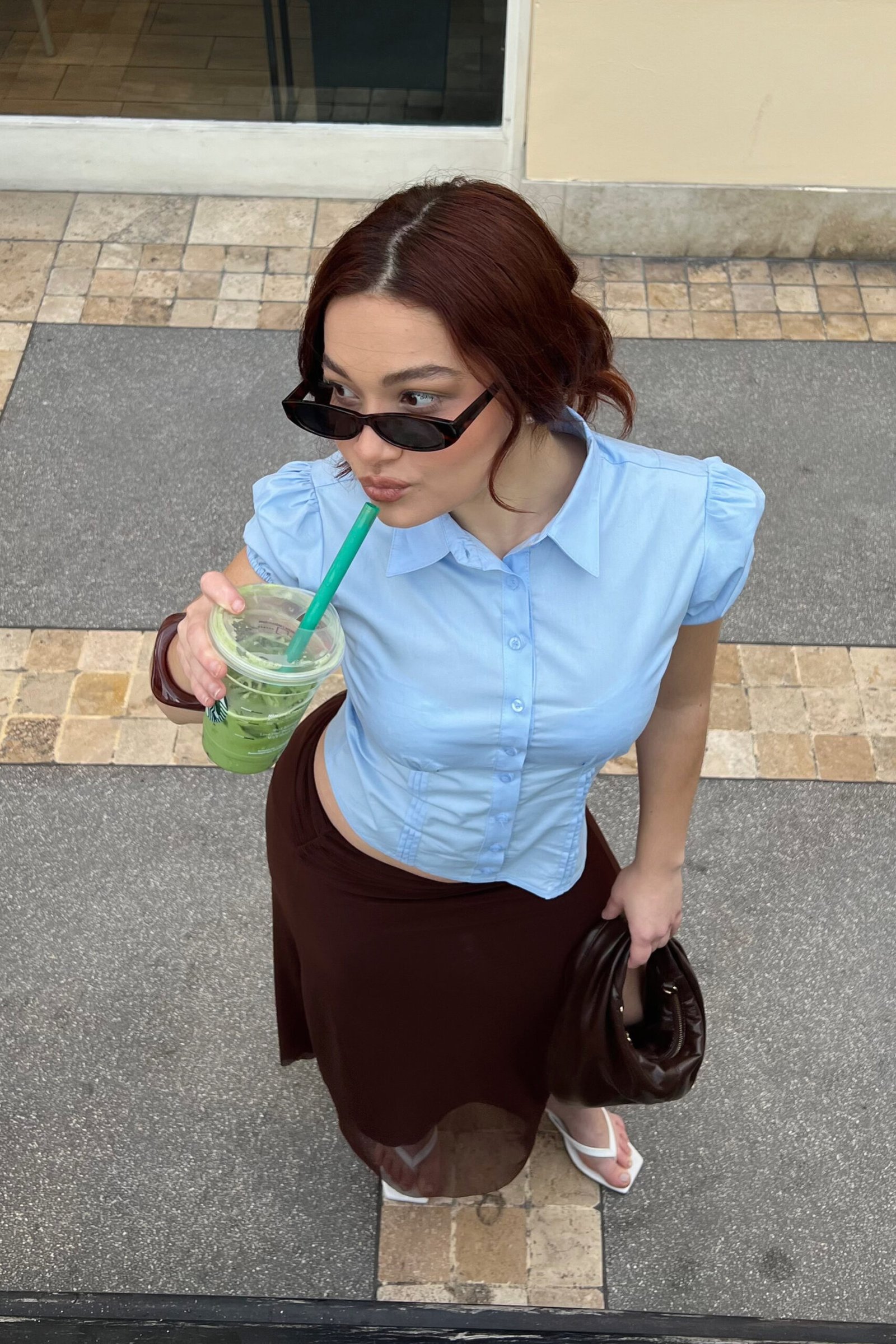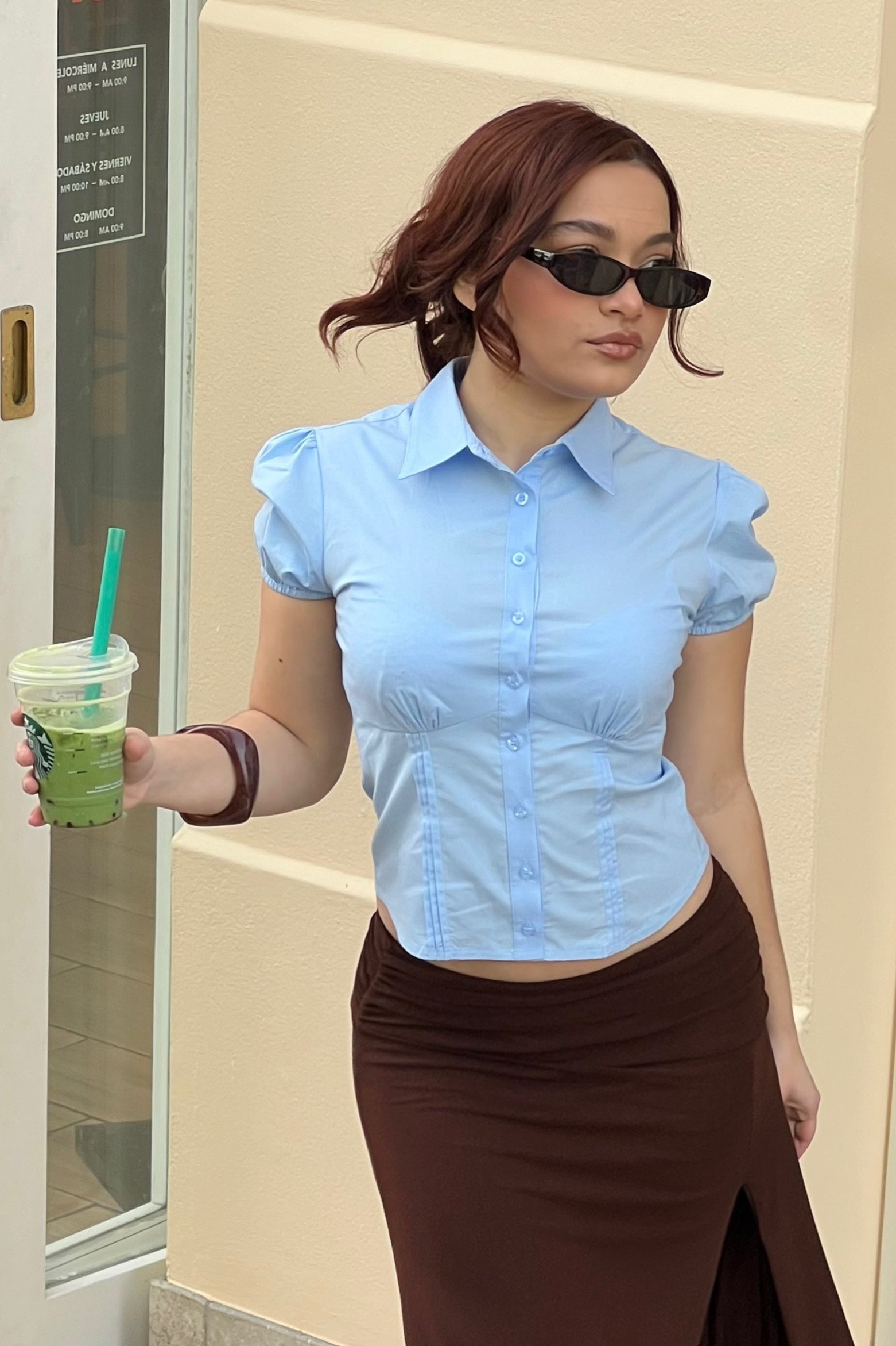 Blusa en manga corta corrugada con botones al tono en el delantero y pitas regulables en la espalda