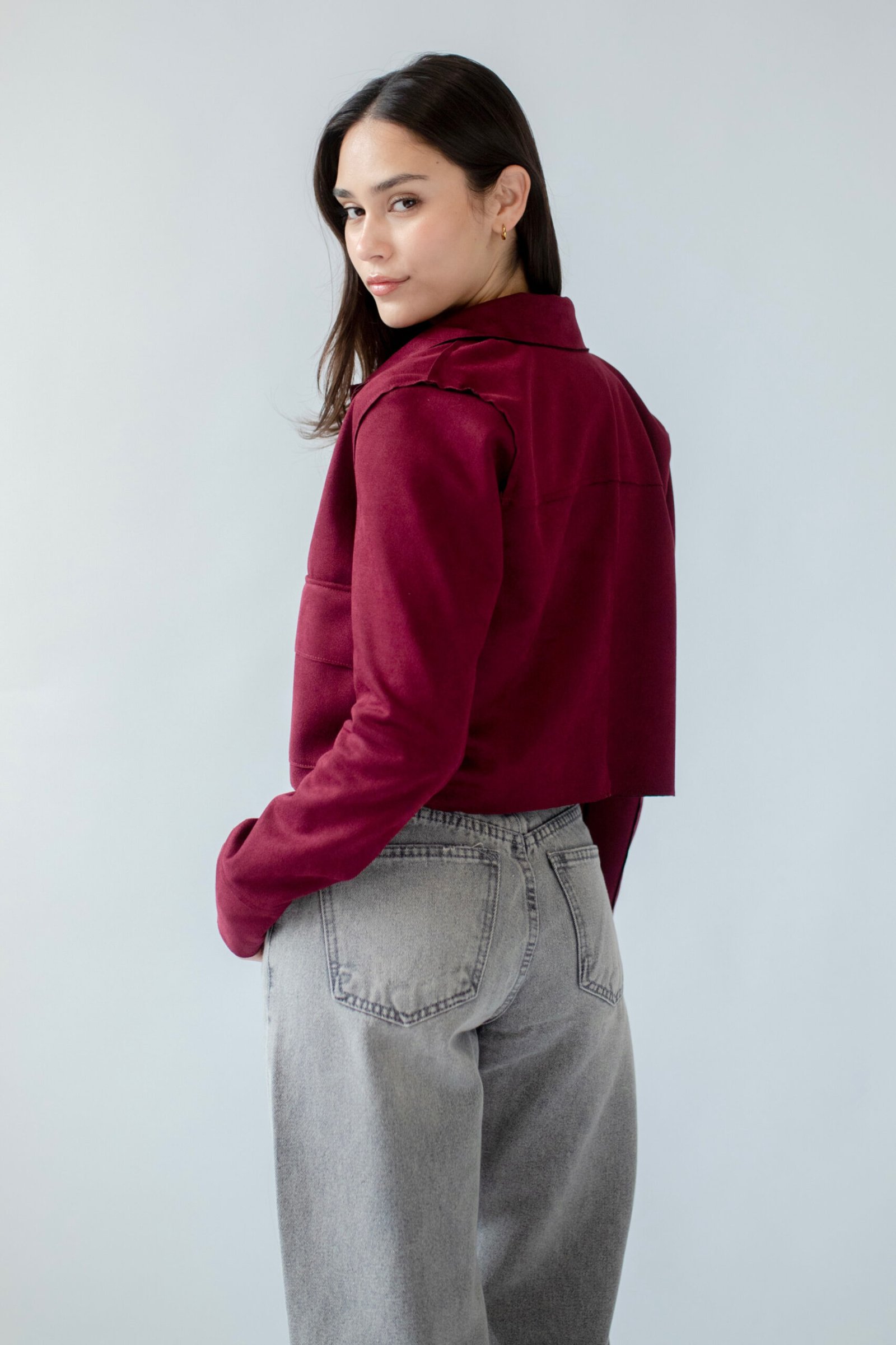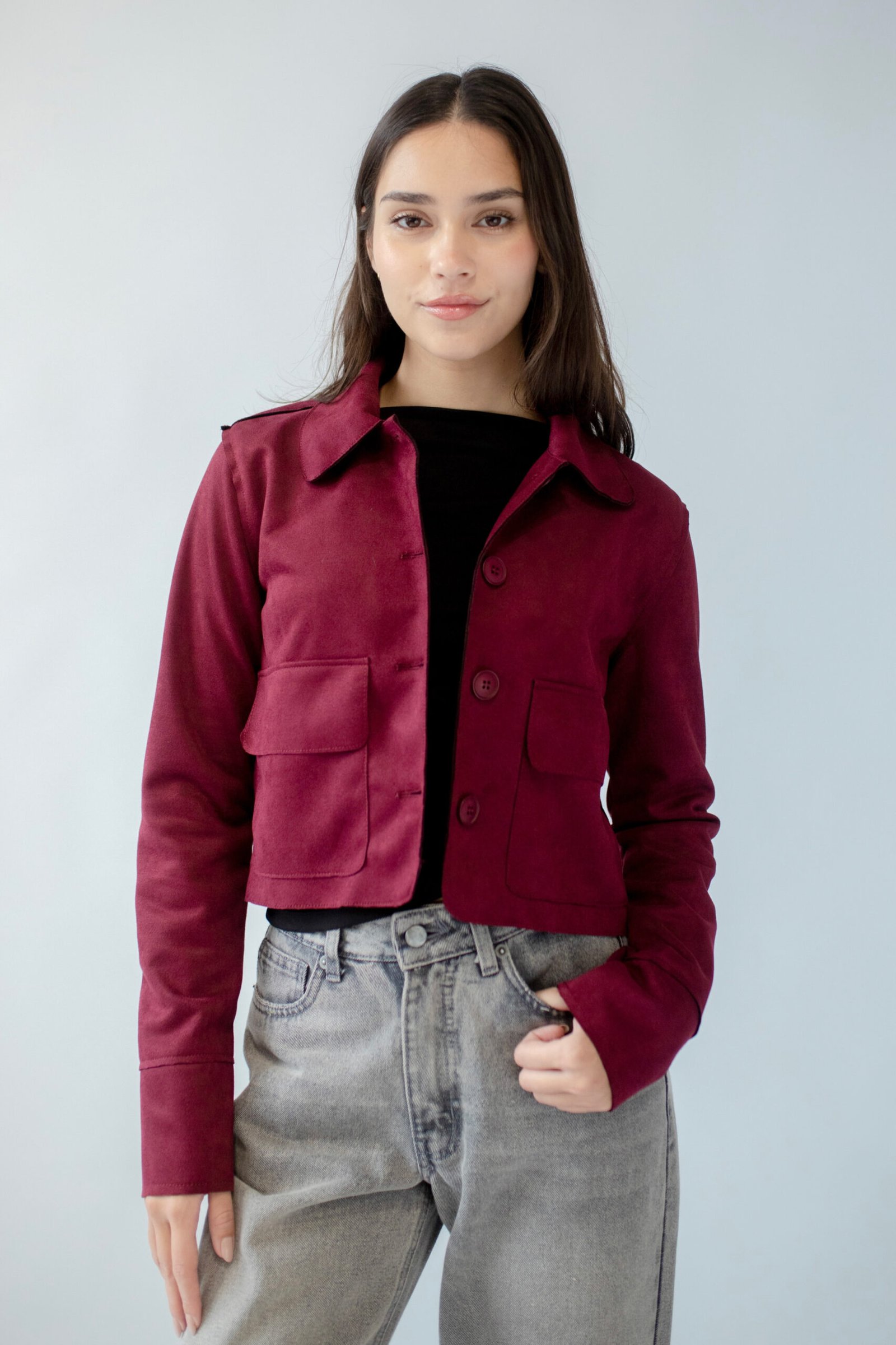 Chaqueta oversize en tela suede, lleva dos bolsillos en el delantero y botones al tono