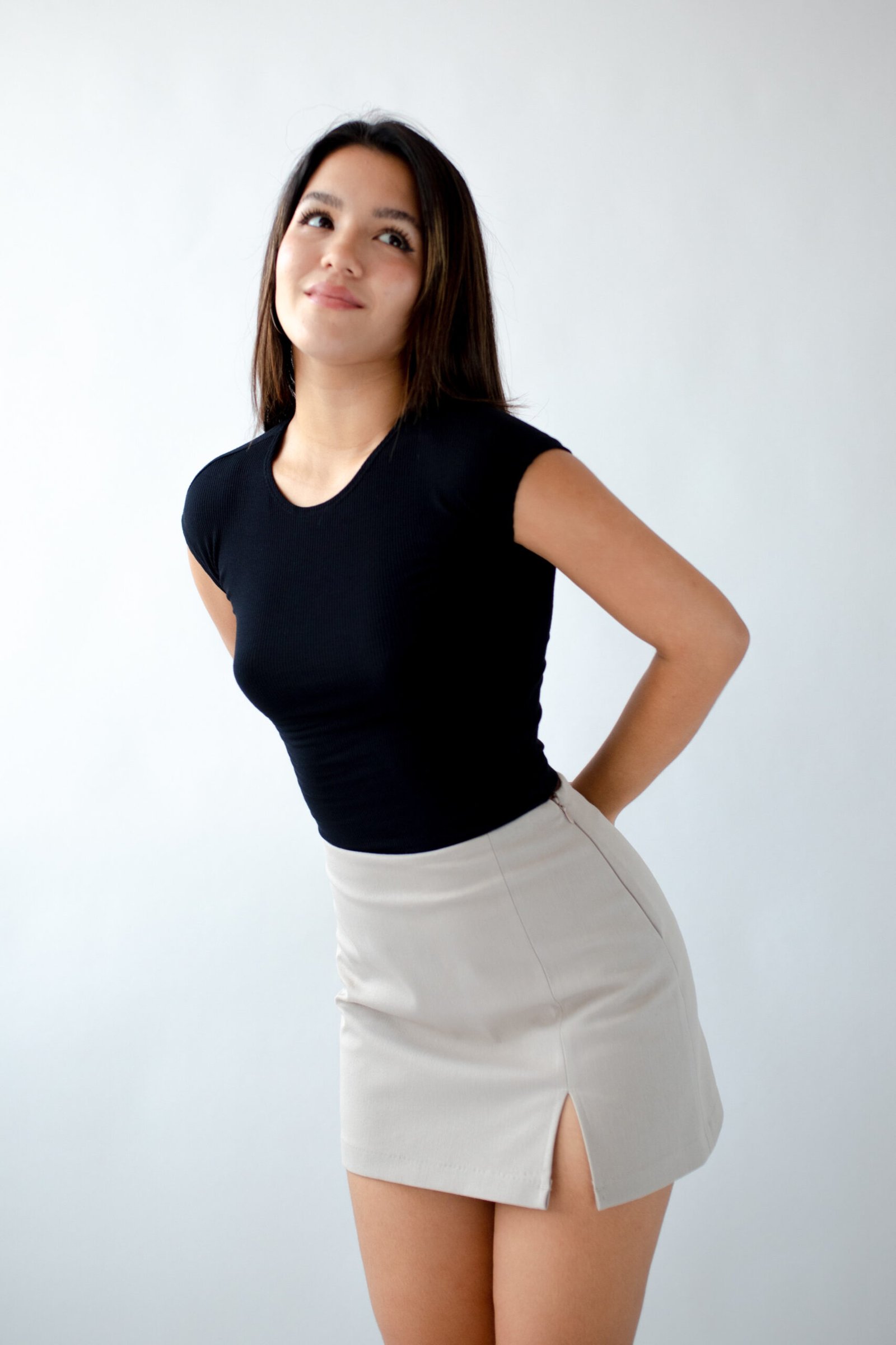 FALDA CORTA SASTRE CON ABERTURA A UN LADO Y CIERRE, LLEVA SHORT LICRADO INTERNO.