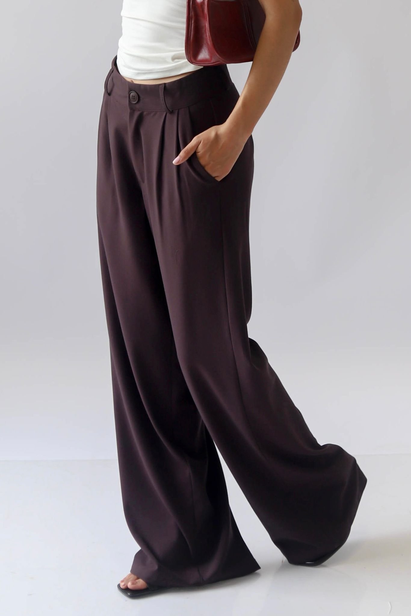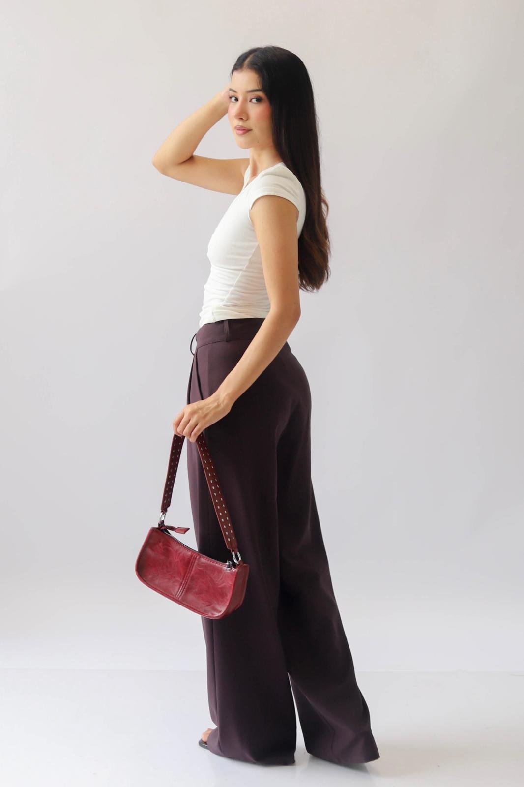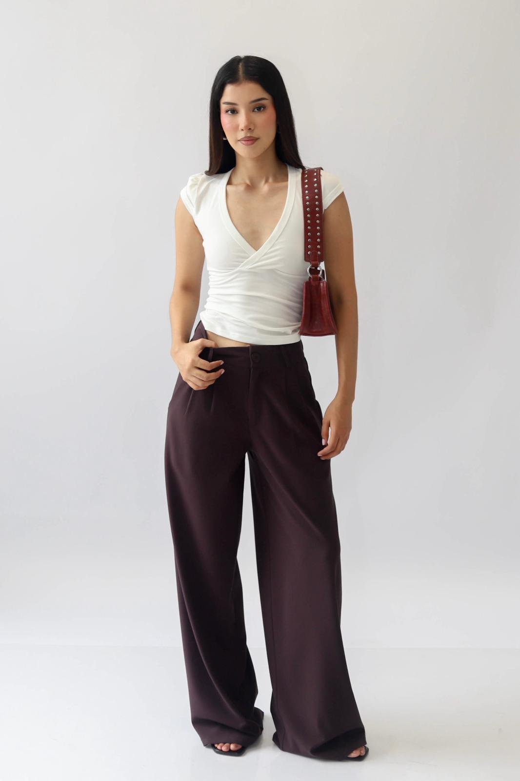 Pantalón de corte holgado con pinzas en la espalda pliegues en la cintura. Tiene bolsillos laterales, cierre y un botón en el delantero