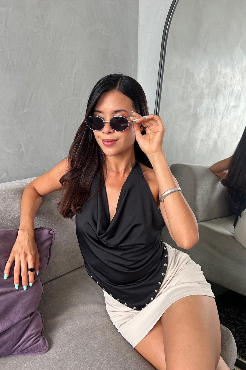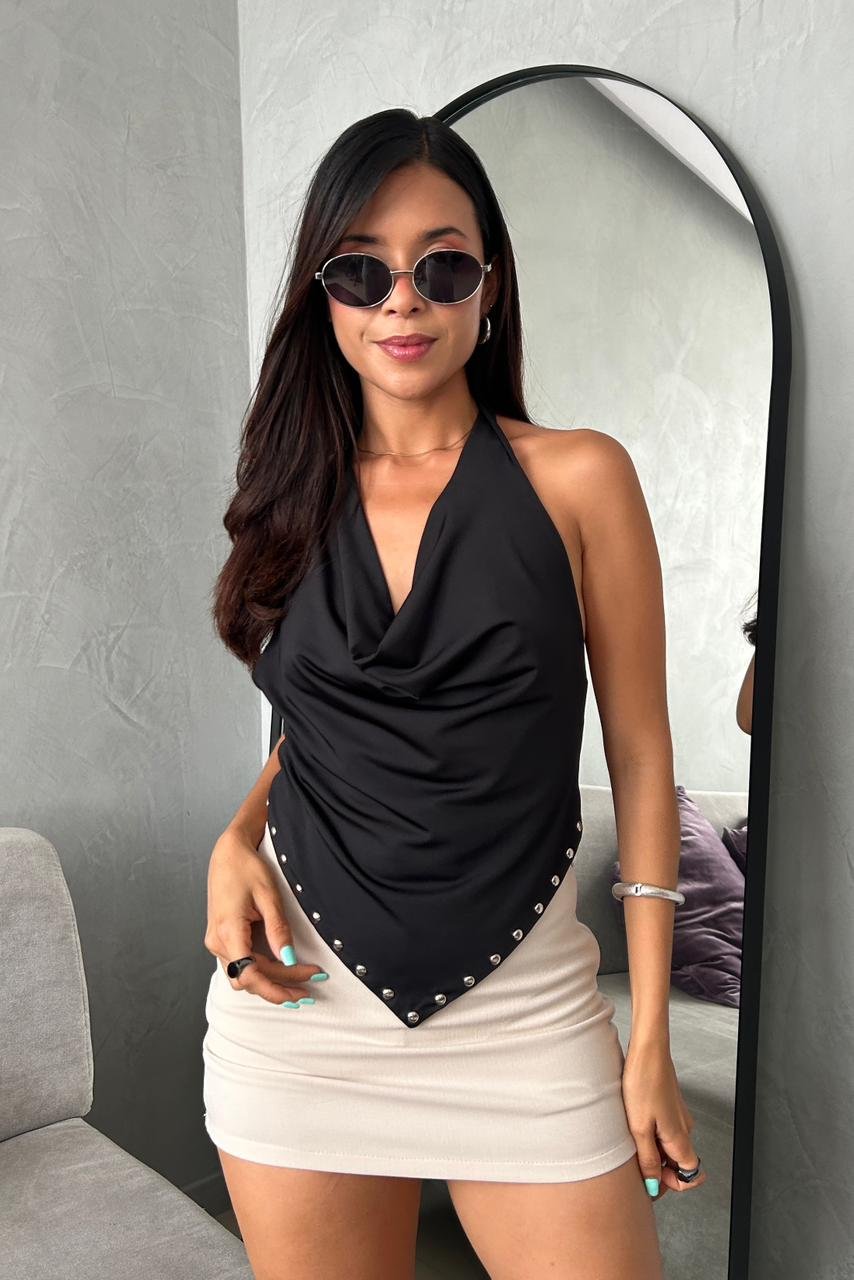 Top asimétrico que se adapta a dos tallas ya que tiene pitas ajustable en el espaldar, lleva detalle de tachas en el delantero