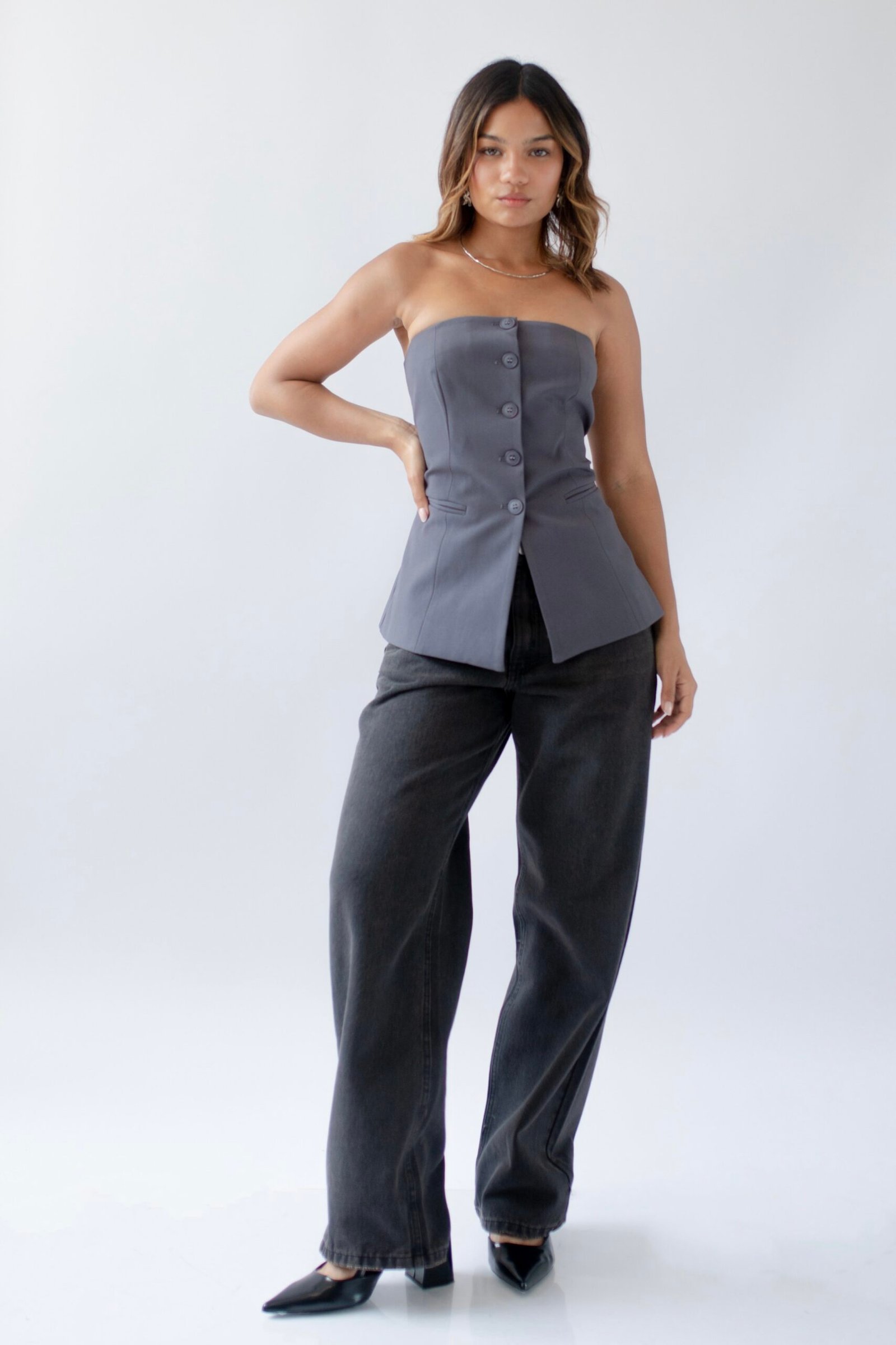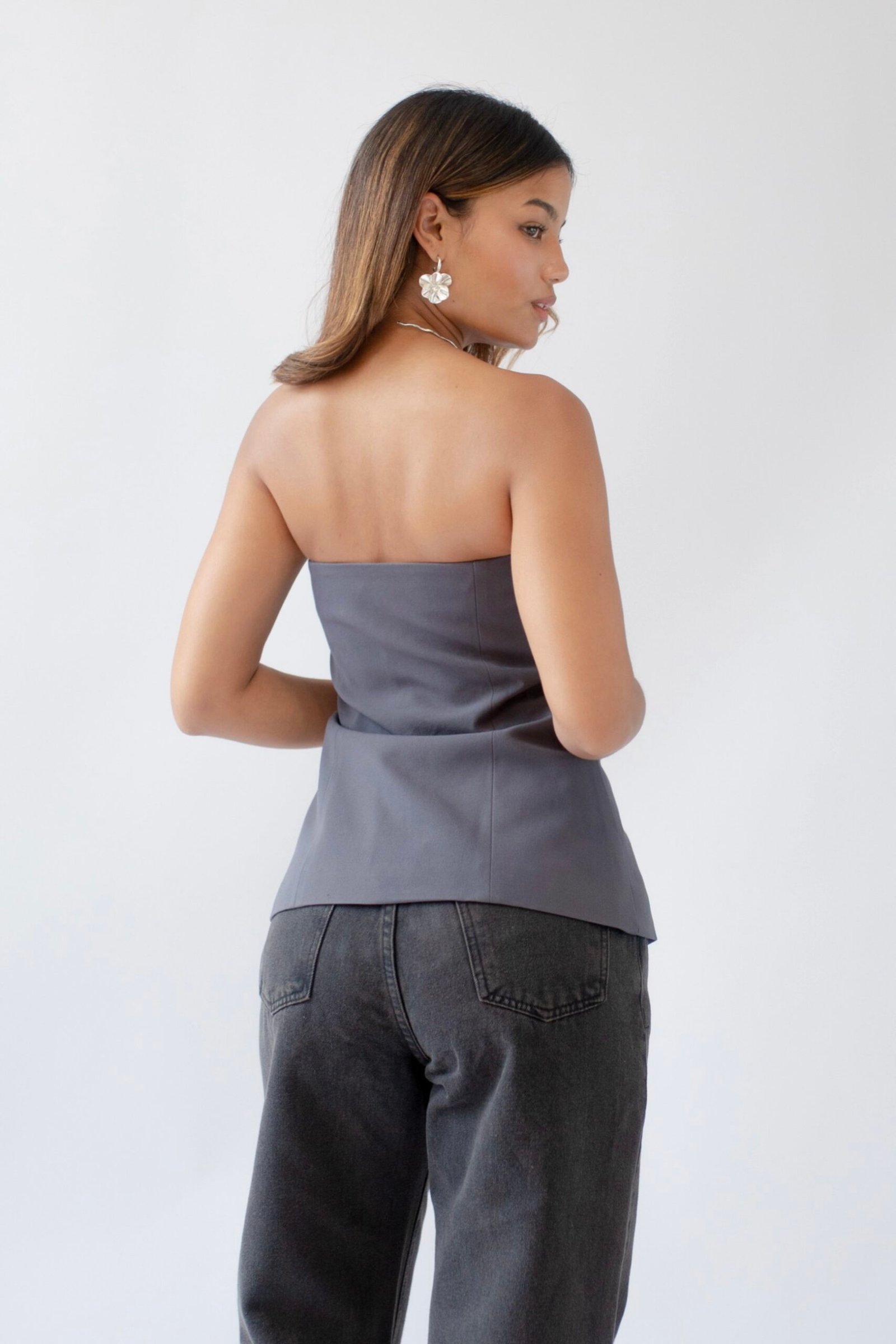 Top straple largo con botones al tono, cuenta con detalles de bolsillos en el delantero